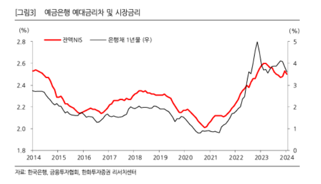 김도하 한화투자증권 연구원은 4일 보고서에서 “은행 업종 예대금리차(NIS)는 1월 말 2.50%로 전월 대비 -0.03%포인트(p), 전년동월 대비 -0.08%p를 기록했다”며 이 같이 분석했다.